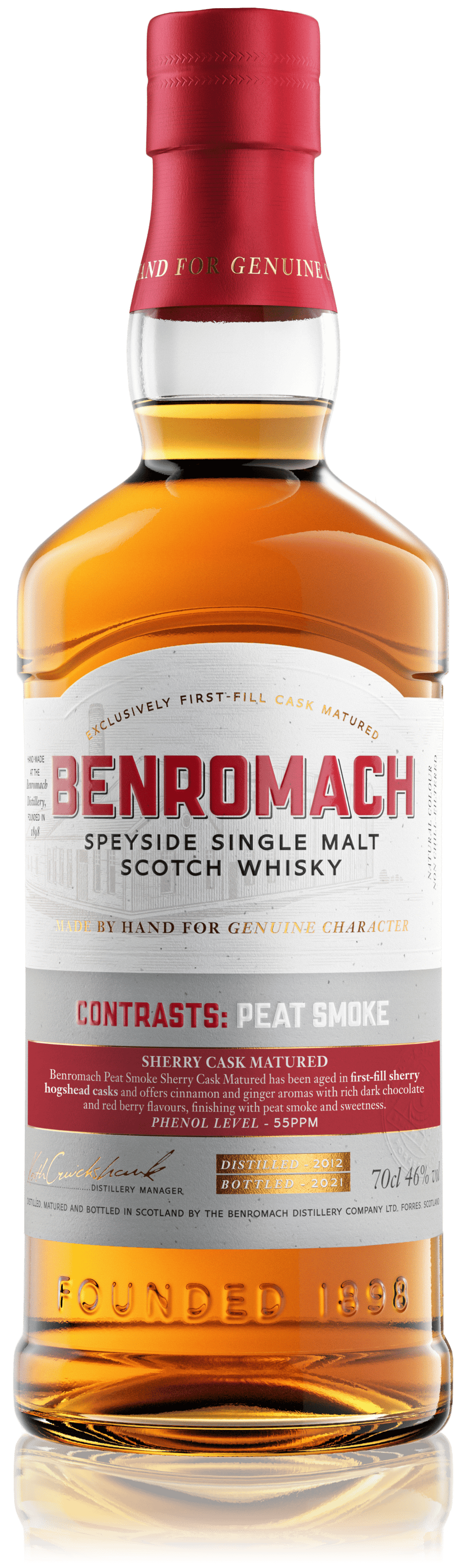 Only ever matured in the finest oak casks, our Benromach 12 Year Old single malt delivers black pepper, Sherry-soaked fruit and chocolate with orange peel and a touch of smoke.