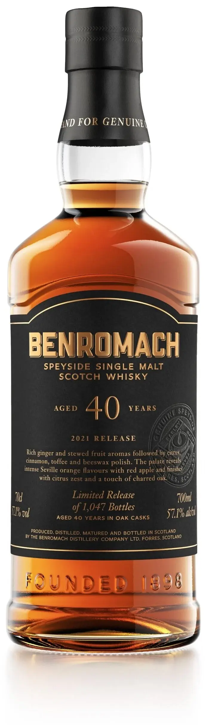 Matured in the finest hand-selected first-fill Oloroso Sherry casks, our Forty Year Old single malt delivers rich ginger and stewed fruit aromas. Seville orange, red apple and demerara sugar followed by a citrus zest finish.